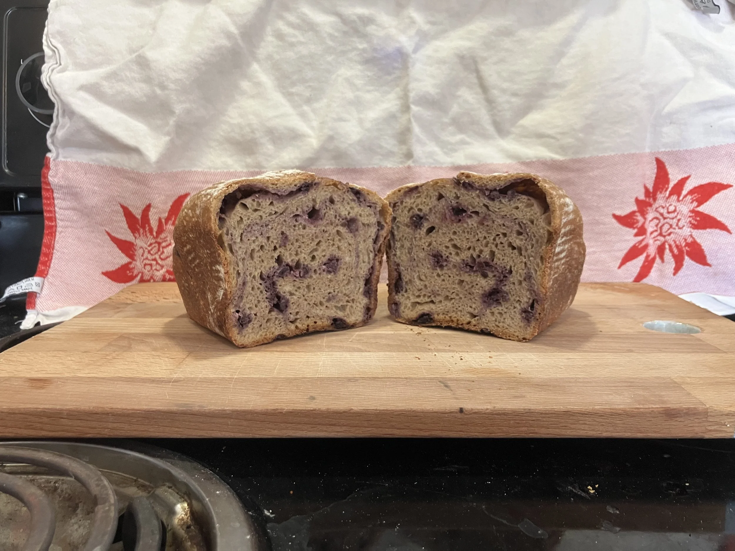 This hearty loaf is made with white flour, whole wheat flour, lentil flour, ground flax seed, chia seed, salt, and water, then swirled with blueberries and cream cheese. The blueberries add a hint of sweetness, making it the perfect base for French toast that’ll keep you full until lunch!